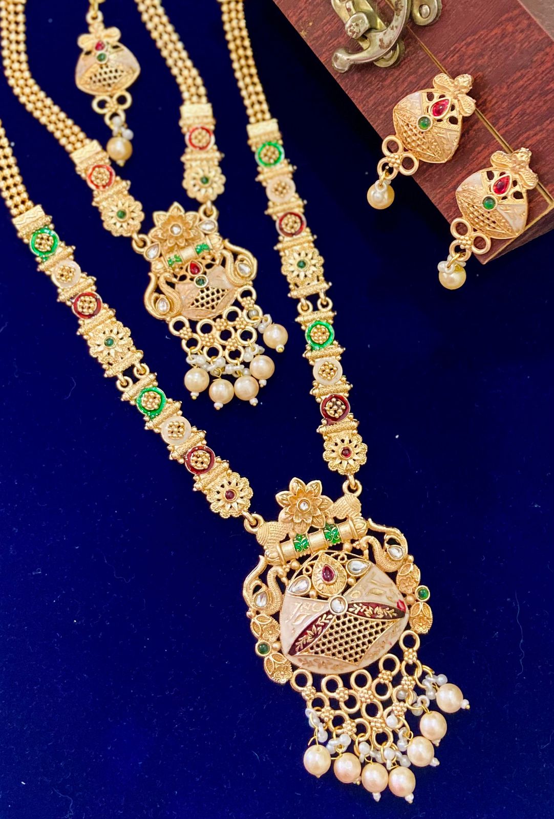 The necklace showcases a bold and graceful design, adorned with detailed carvings and temple-inspired patterns. The earrings and maangtikka mirror the same divine motifs, creating a cohesive and majestic look that pairs perfectly with sarees, silk lehengas, or traditional outfits.