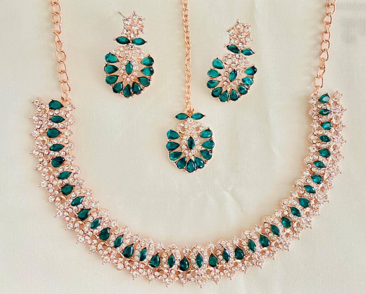 Bring a touch of regal elegance to your ethnic look with this stunning Green-Colored Heavy American Diamond Necklace Set, designed to offer the beauty of traditional jewelry with the ease of lightweight wear. This eye-catching set includes a grand necklace, matching earrings, and a coordinated maangtikka, making it the perfect accessory for festive events, weddings, or family gatherings.