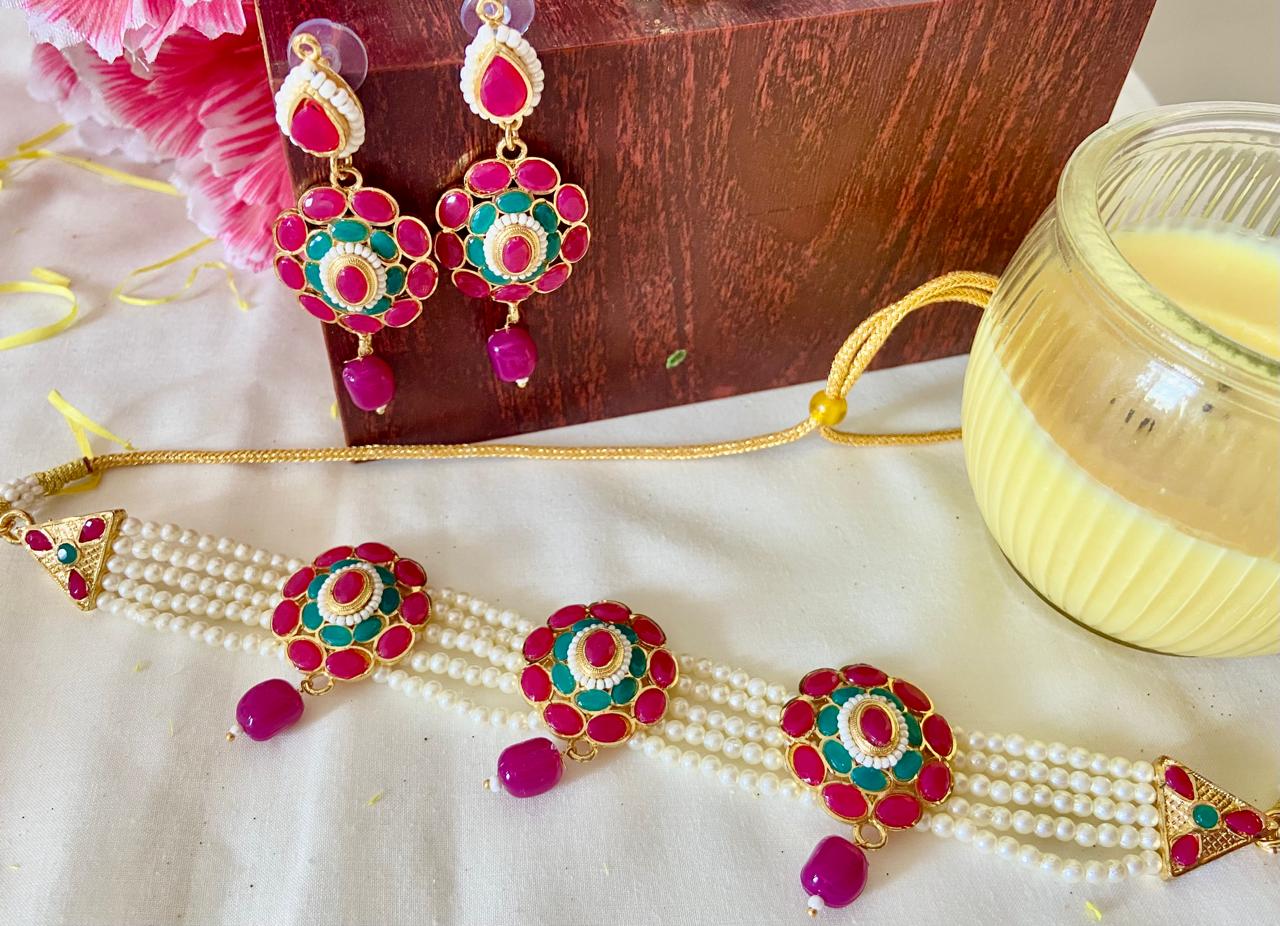 Expertly crafted, this red pearls chocker set is the perfect accessory to elevate any outfit. The lustrous pearls provide a touch of elegance and sophistication, while the vibrant red color adds a pop of boldness. This versatile set can be dressed up or down for any occasion.